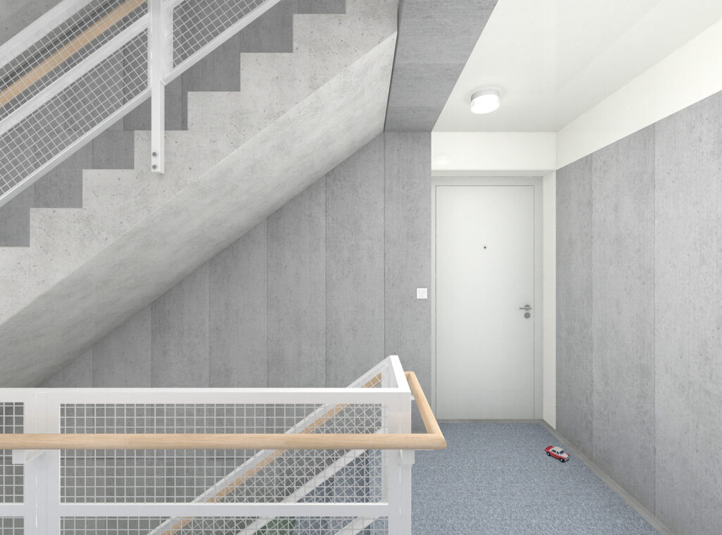 Boden, Wand + Decke KLARK Klima Beton Treppe Betonfertigelement Bodenbelag Kugelgarn Geländer mit Gitterfüllung Metall Handlauf Eiche