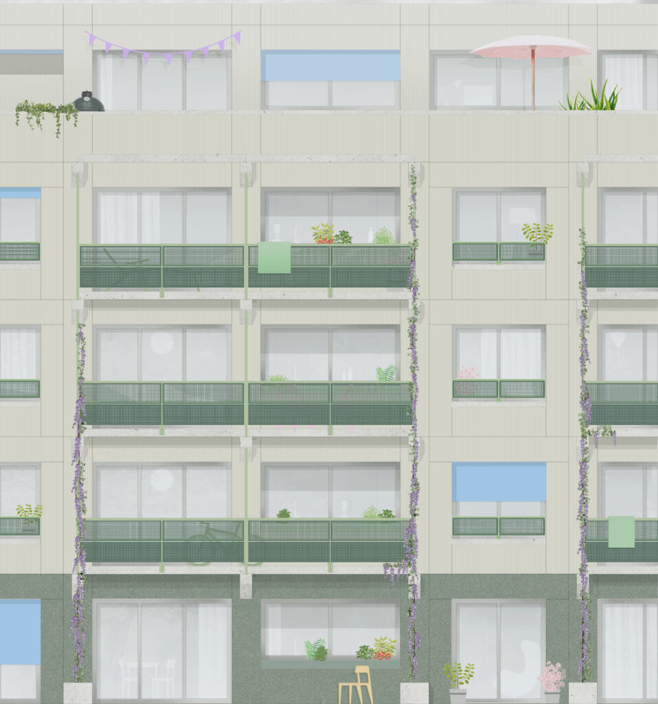Sonnenschutz Stoffstoren Rankpflanze Glyzinien Fassade Obergeschosse Faserzementplatte mit Plissierung Fassade Sockel Faserzementplatte Geländer + Rankstange Metall Brüstung Lochblech Balkon Betonfertigelement