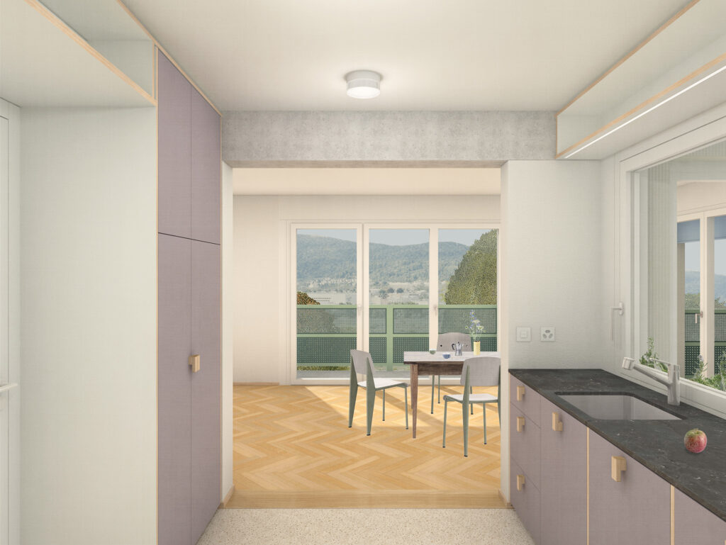 Schreinerküche Kunstharz mit Eichengriff Küchenabdeckung Naturstein Granit Sockelleiste Eiche Boden Anhydrit Wand + Decke Verputz Sichtbares Tragwerk Betonfertigelement Sichtbares Tragwerk Betonfertigelement Armaturen / Geräte Küche Induktionsherd Bora Backofen V-Zug Kühlschrank V-Zug Armaturen KWC Spülmaschine V-Zug