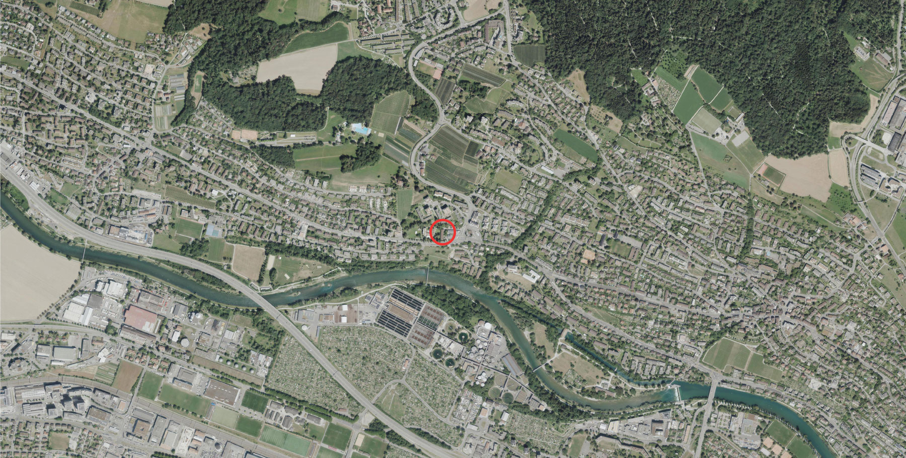 Der unmittelbare Kontext ist durch seinen üppigen Grünraum mit seinen grossgewachsenen Bäumen geprägt. Im Westen befindet sich der Park des städtischen Wohnzentrums Frankental.